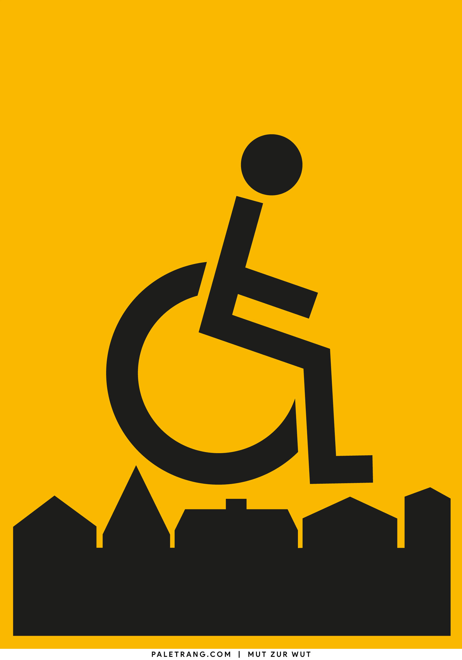 Dieses Poster kombiniert zwei vertraute Symbole: das Behindertensymbol und ein städtisches Straßenschild. Die Stadtsilhouette steht für kaputte, unzugängliche öffentliche Räume – Schlaglöcher, bröckelnde Bürgersteige, steile Bordsteine und das Fehlen von glatten Wegen. Die Person im Rollstuhl ist darin gefangen.