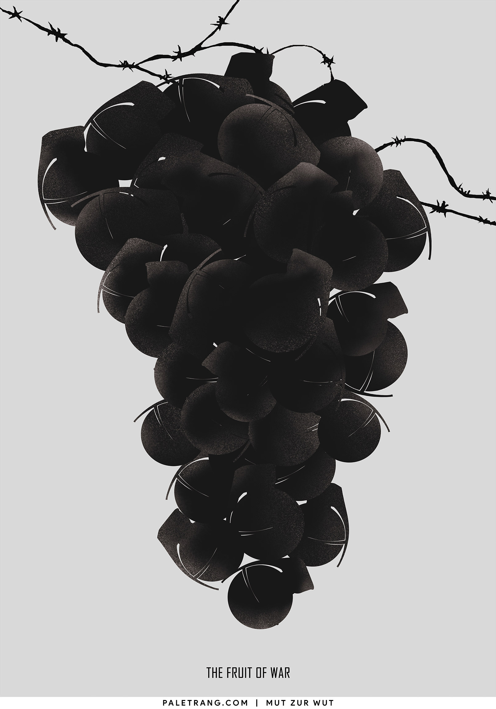 This artwork uses the form of traditional Chinese ink painting to depict grapes made from grenades and barbed wire—symbolizing how the consequences of war bring only suffering and sorrow, like bitter fruit. This sharply contrasts the sweetness usually associated with grapes, merging two opposite sensations into one. It invites the viewer to “taste the bitter fruit of war”—a plea for peace and the avoidance of conflict.