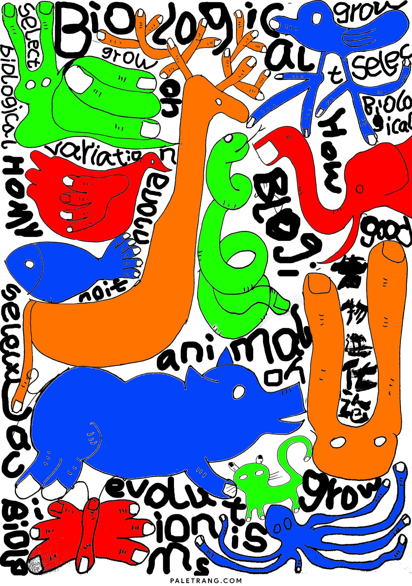 This work uses fingers and animals to combine graphic creativity. Because of the destruction of the nature of human beings, the killing of living things, so the creatures continue to evolve, mutate into colorful colors, but also grow human hands, in an attempt to resist this evil. Hope to warn people not to kill animals, care about the current global environmental problems.