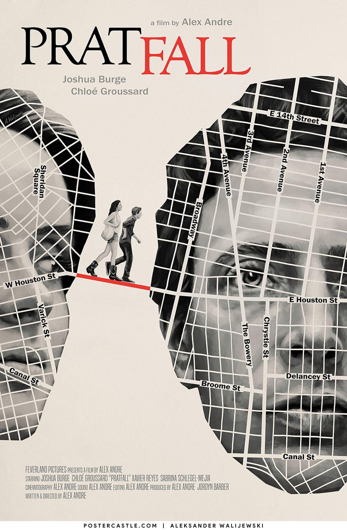 Official poster for Pratfall (2023), a film directed by Alex Andre, starring Joshua Burge and Chloé Groussard.