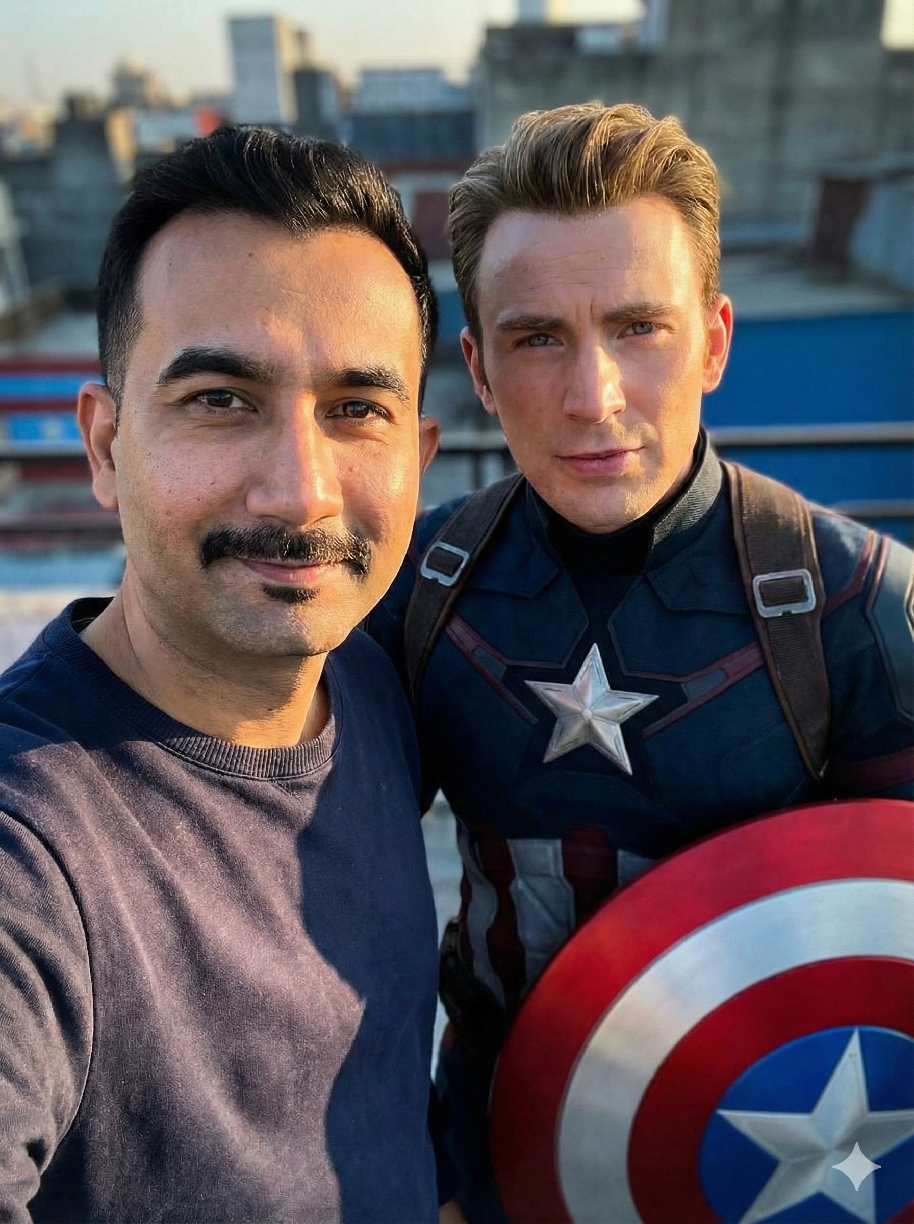 Ultra-realistic cinematic selfie with Captain America holding his shield beside me. Patriotic blue-red color tone, heroic stance, soft sunlight, Marvel movie style lighting, sharp focus, natural skin texture, 4K realism,
